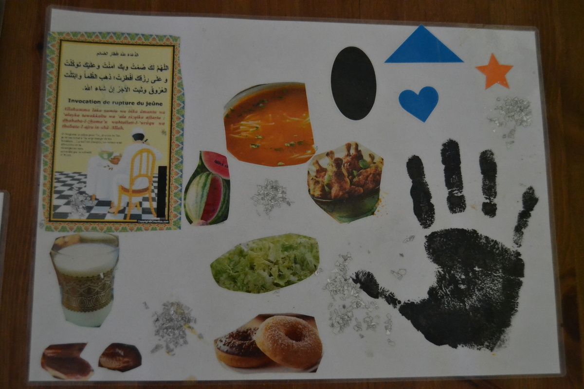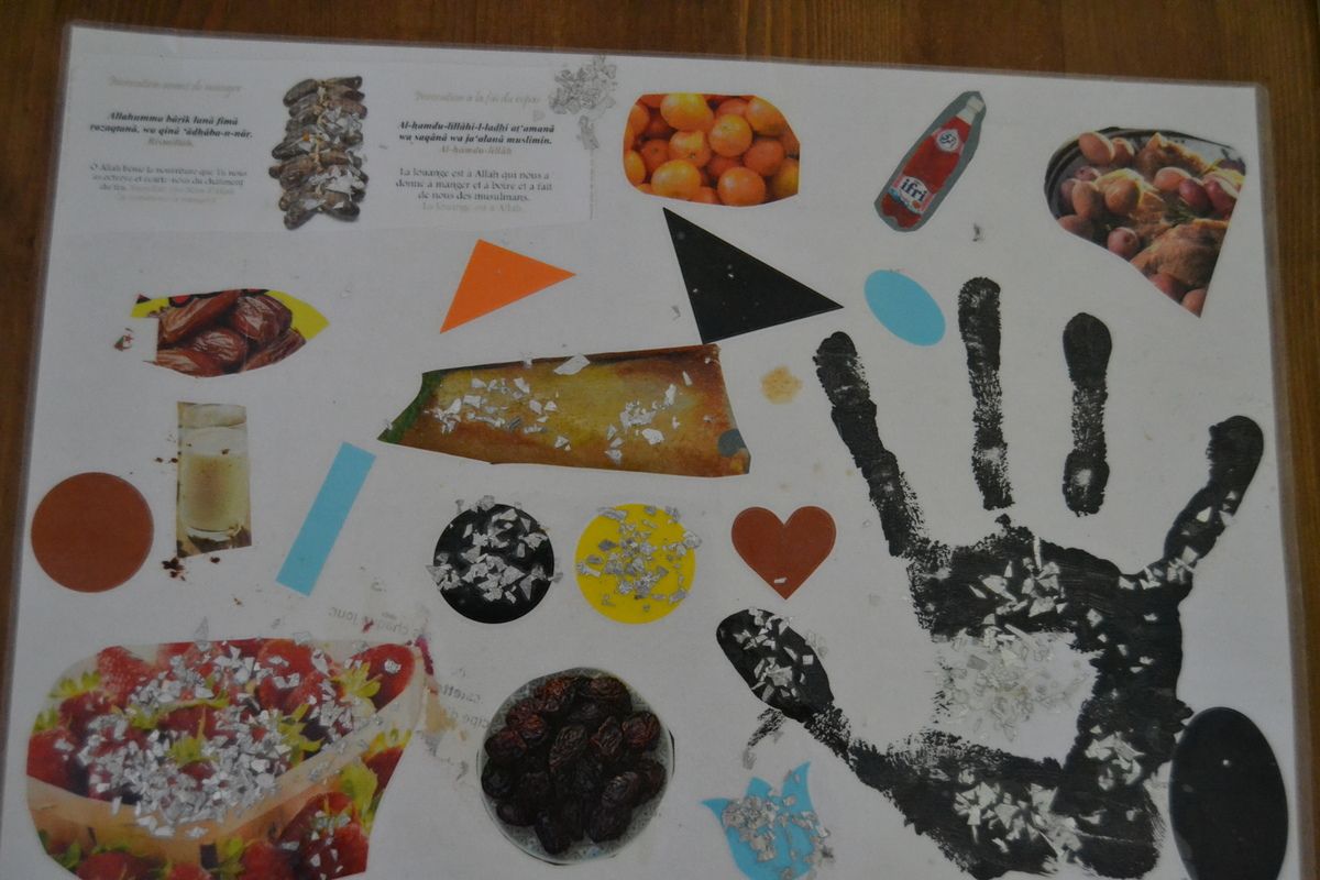 Ils ont mis de la peinture sur leur main droite afin de faire leur empreinte pour se rappeler qu'on doit manger avec cette main-là,puis ont positionné leurs images et leurs décorations.